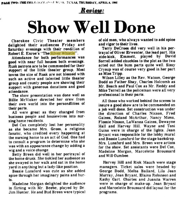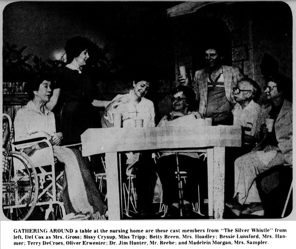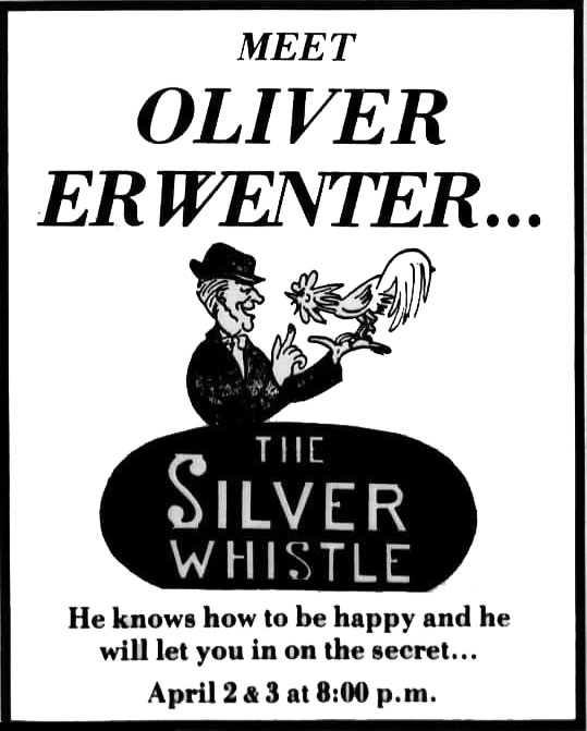 April 2nd and 3rd, 1982 and "The Silver Whistle". In this play, Wilfred Tasbinder, a romantically minded hobo, finds a birth certificate for Oliver Erwenter,