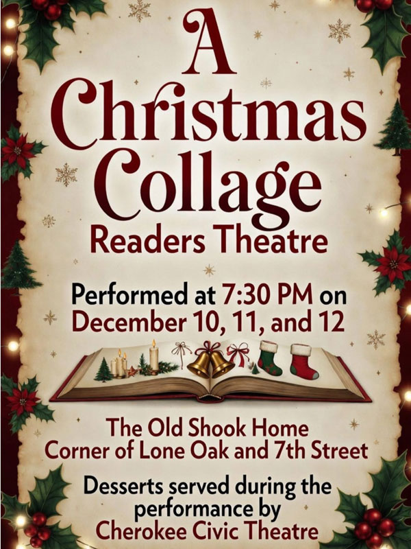 December 1987 CCT presented "A Christmas Collage". This reader's theatre was presented in the old Shook House, owned by Bob and Mary Stallings, and included Christmas desserts served during the performance. Each date was a sellout!